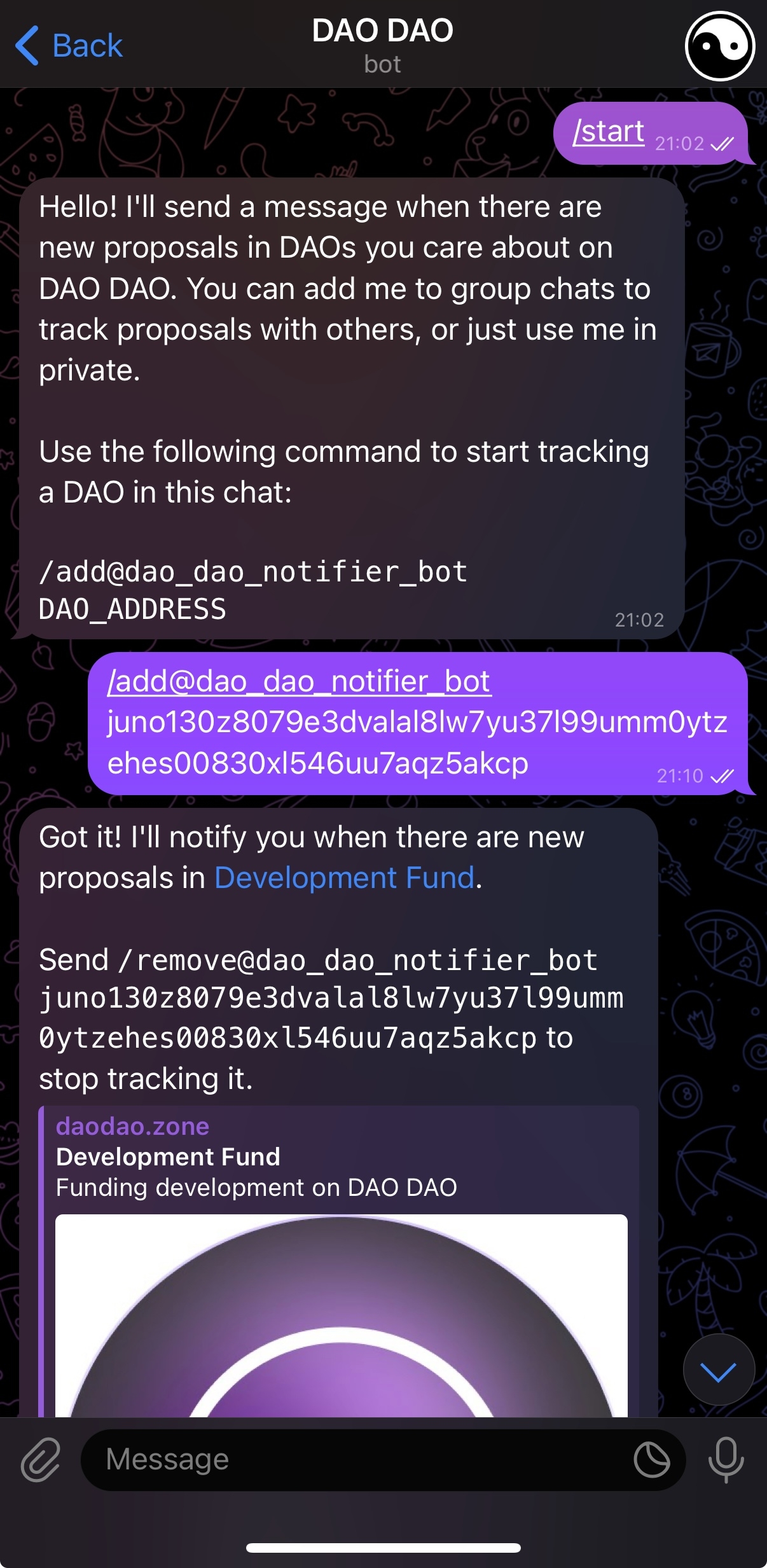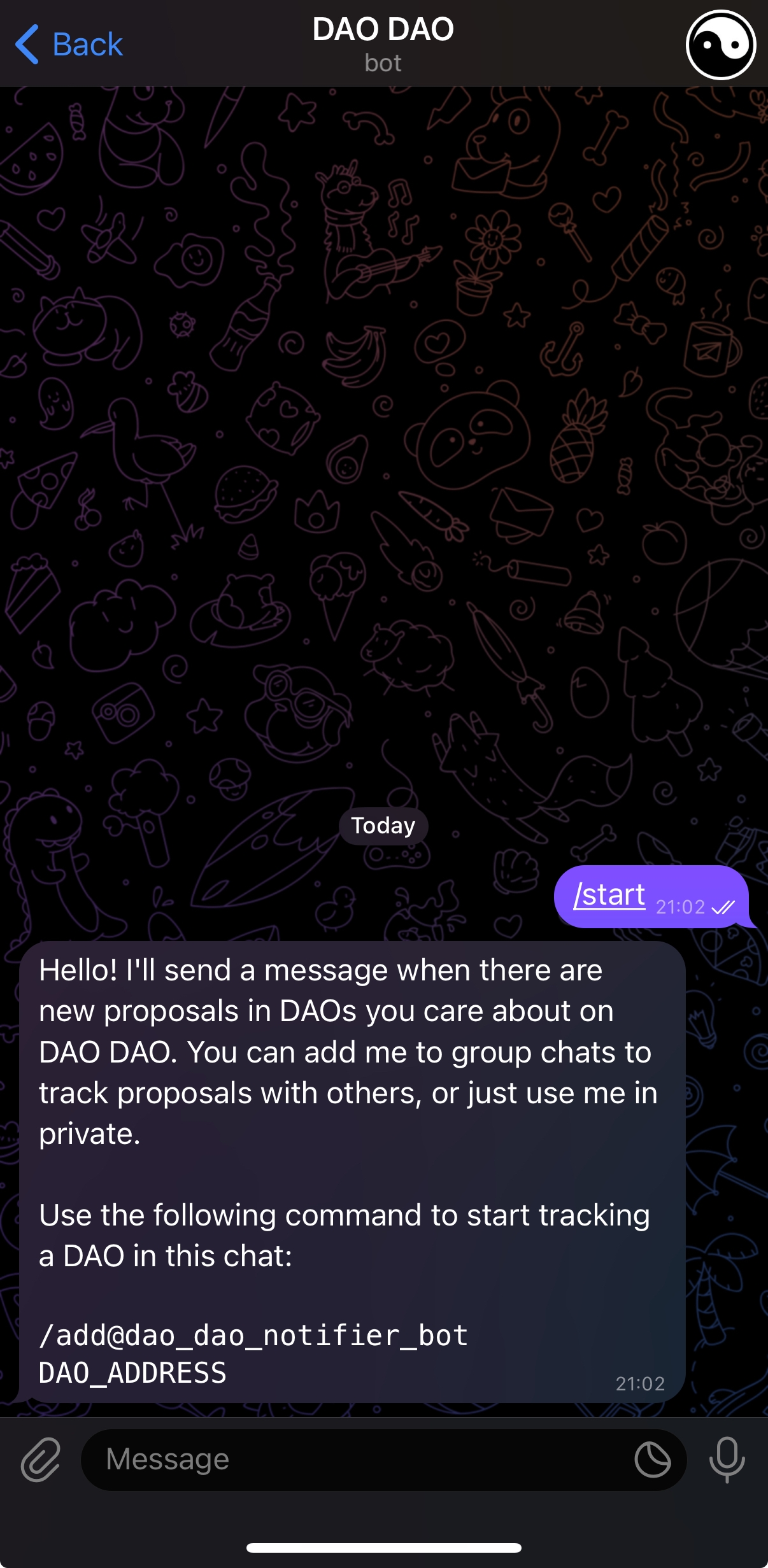 /add@dao_dao_notifier_bot DAO_ADDRESSOn Mobile:
