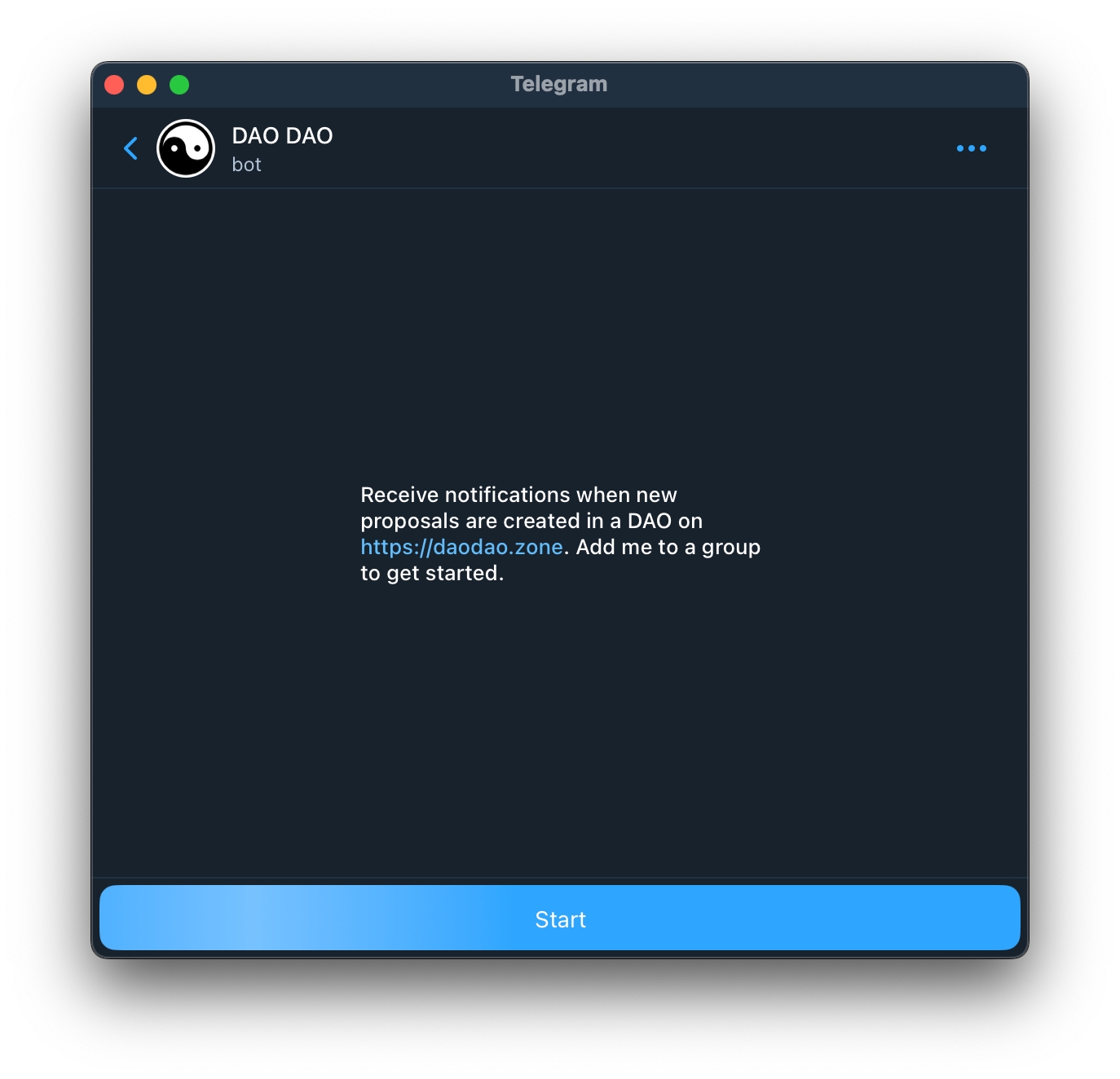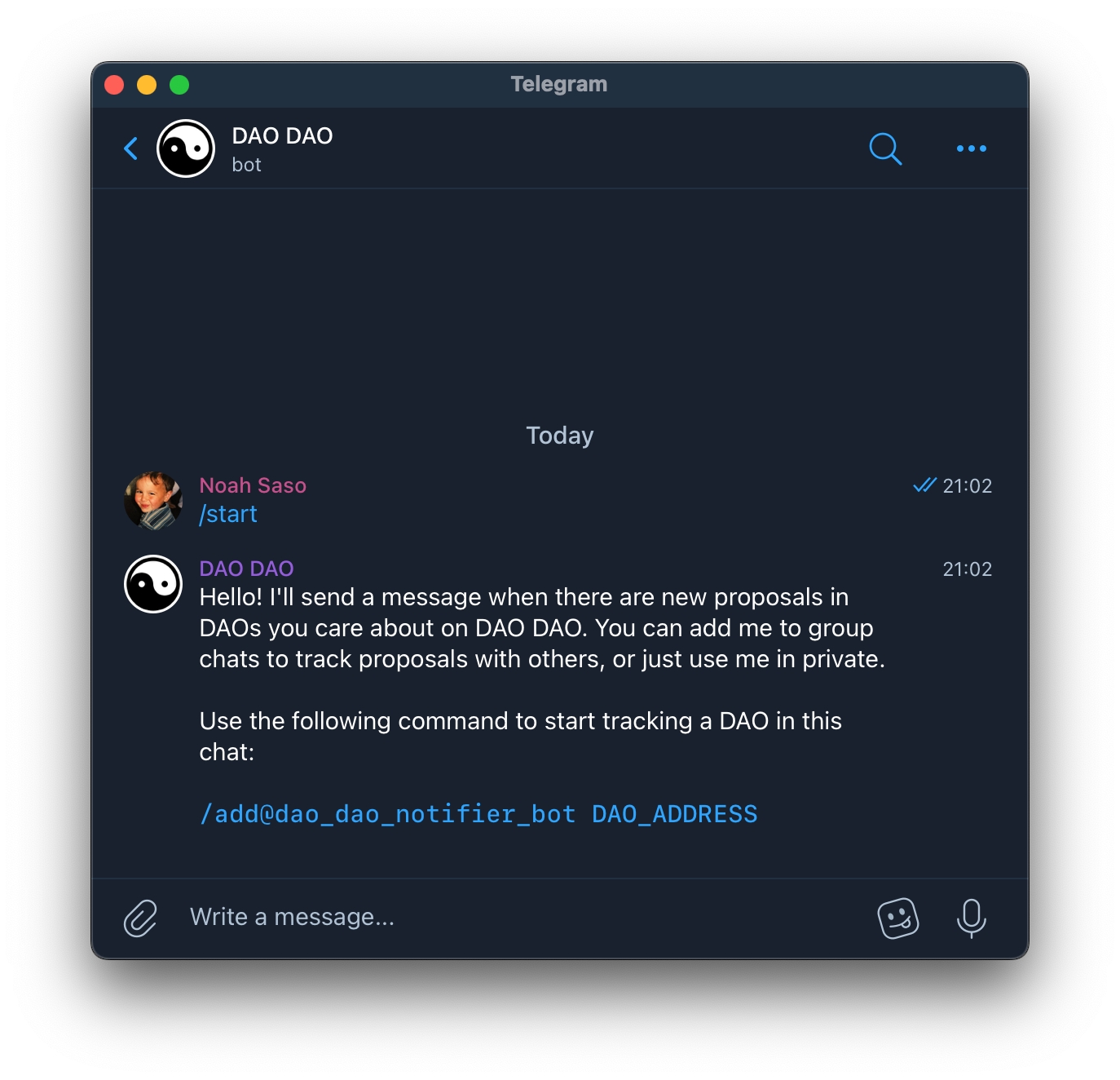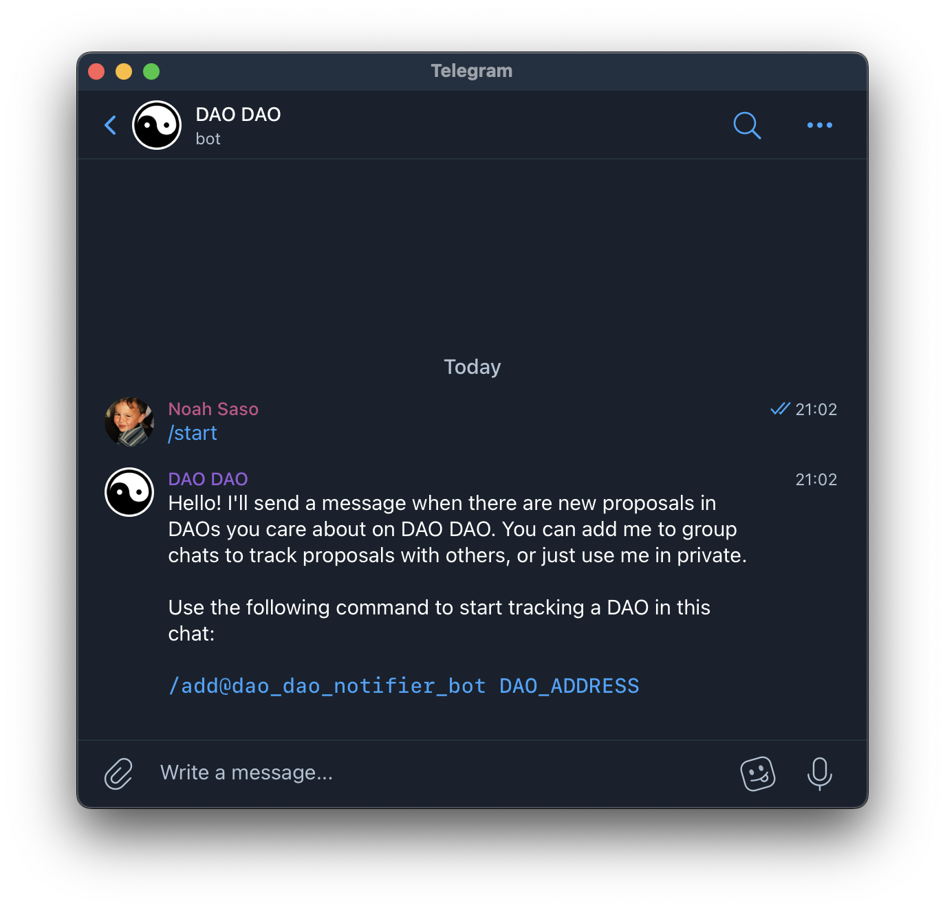 Telegram Desktop Once the bot is in the chat where you want to receive notifications, just send the command shown in the instructions to start tracking a DAO. You can also paste the entire DAO URL from your browser instead of typing the address manually.