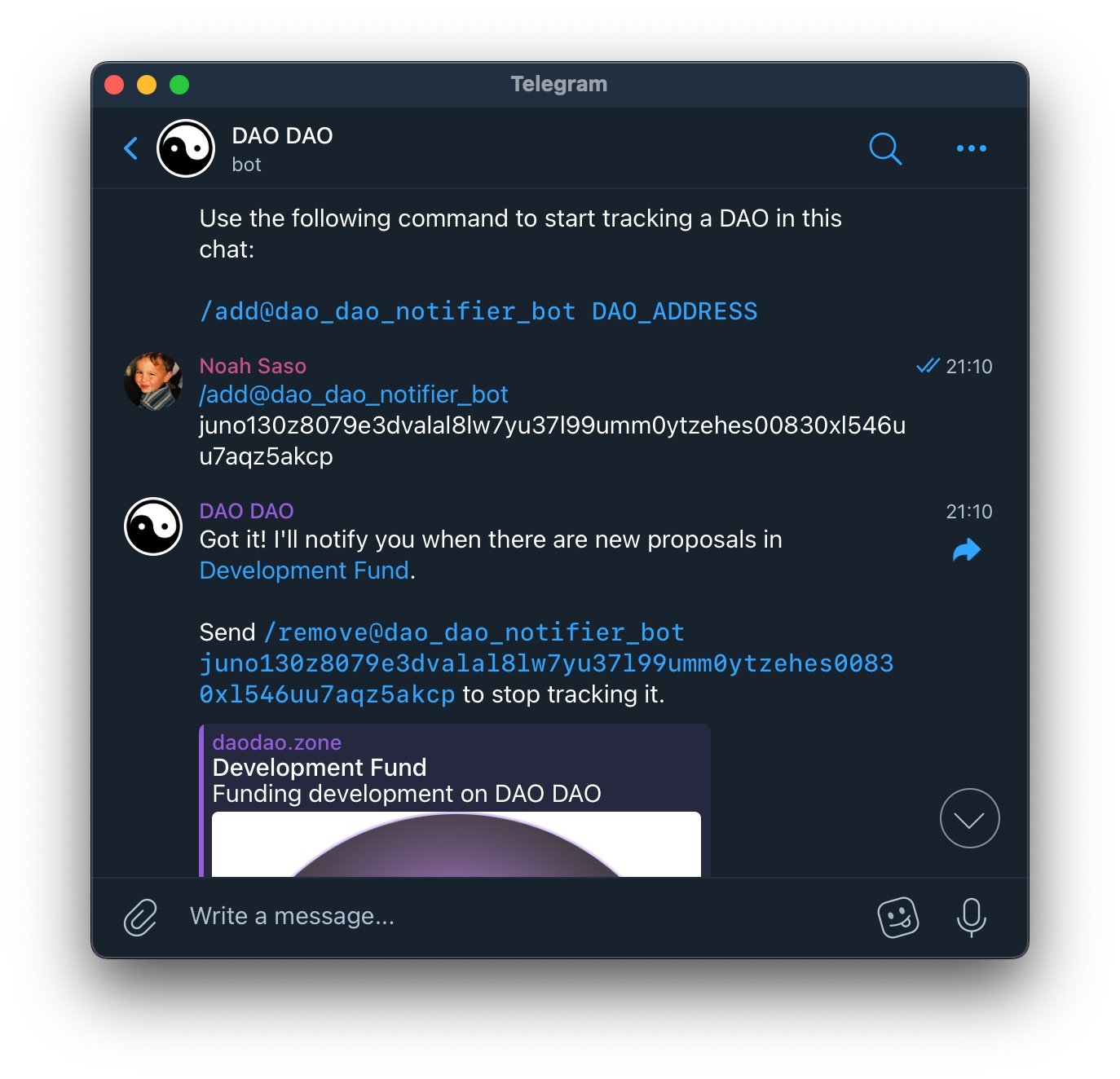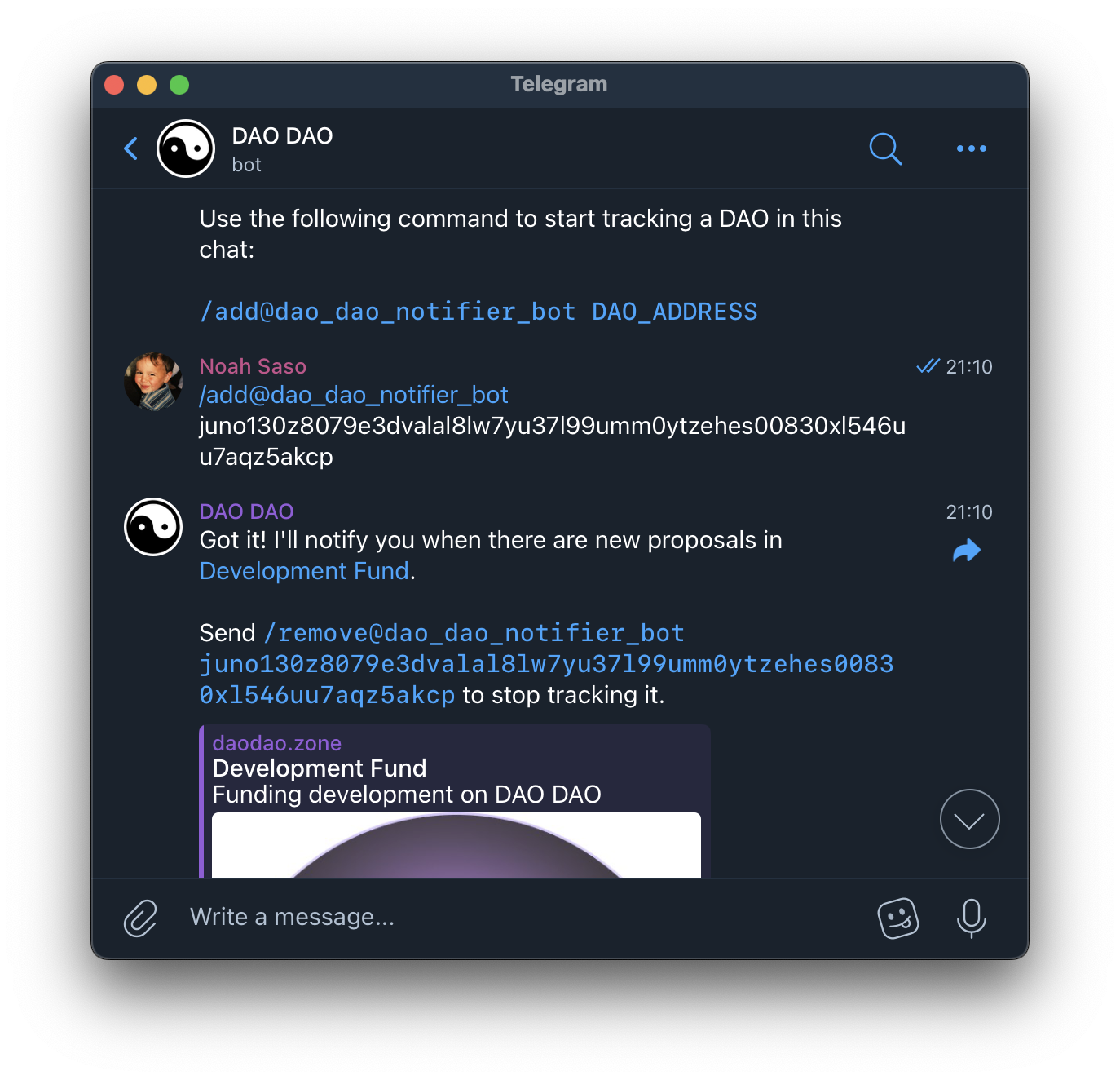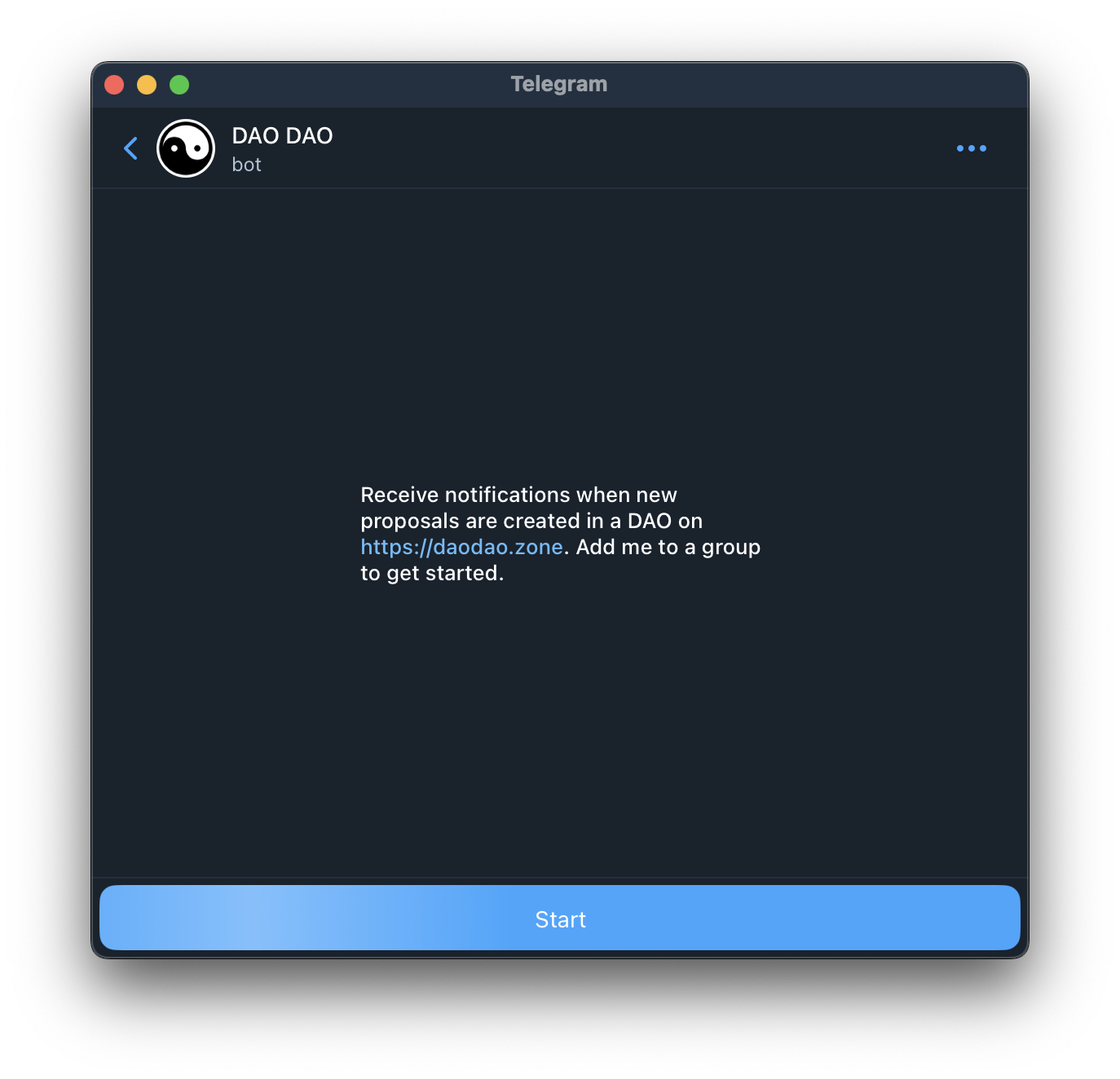 Telegram Desktop Once the bot is in the chat where you want to receive notifications, just send the command shown in the instructions to start tracking a DAO. You can also paste the entire DAO URL from your browser instead of typing the address manually.
