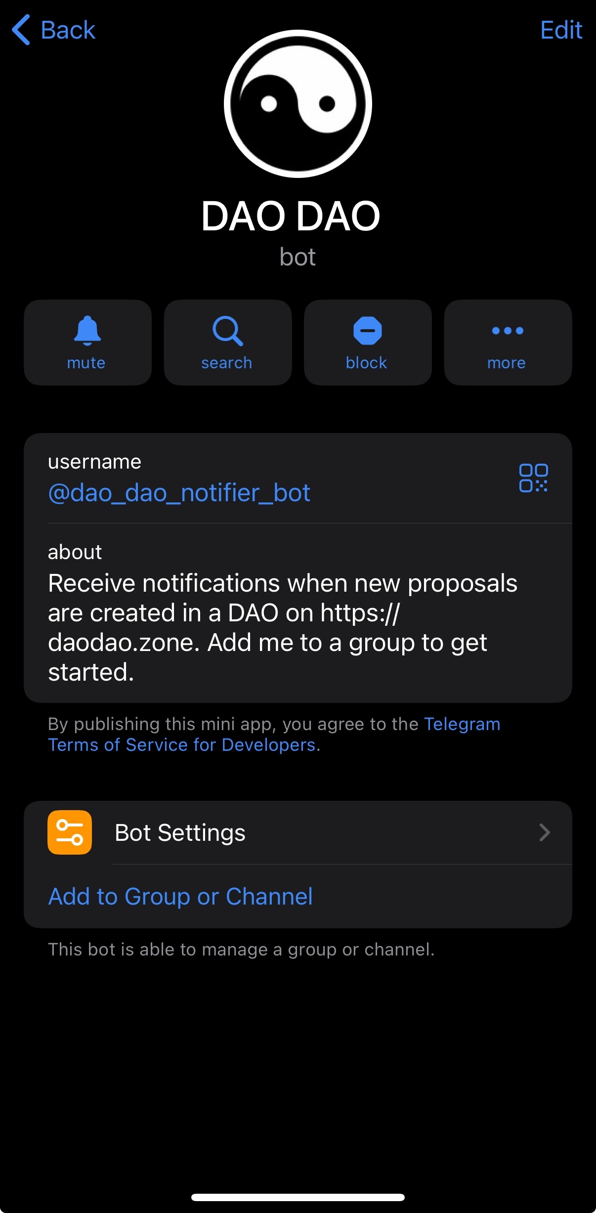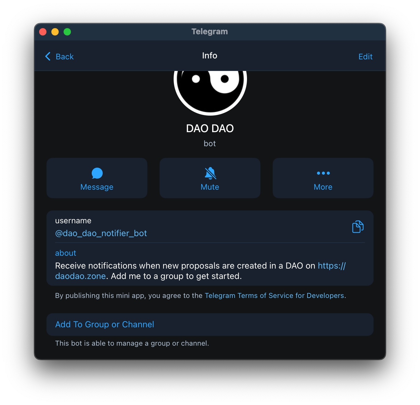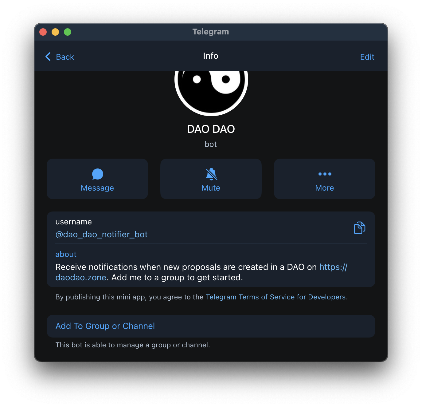 Telegram Desktop If you'd like to track DAOs with other people, add the bot to a group chat by tapping its name at the top of the screen and then tapping the