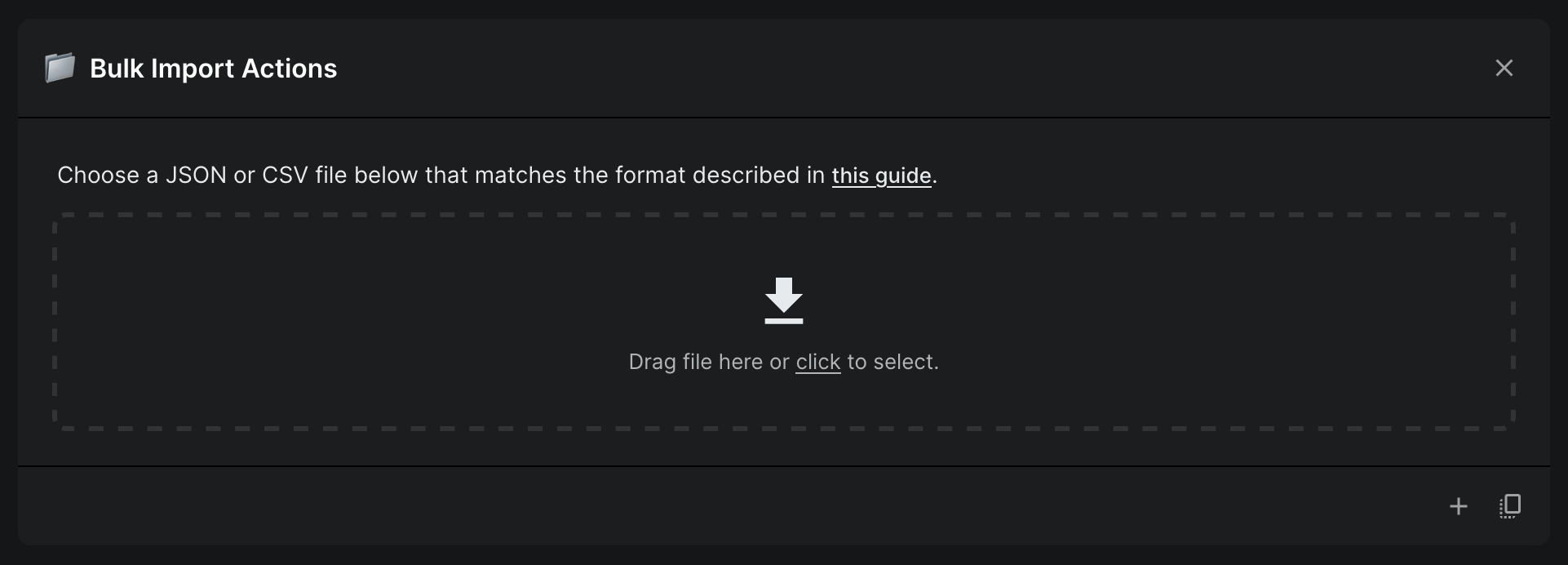 You can use either a JSON or CSV file. CSV files are easier to use but only support some of the actions, whereas JSON files support all actions.