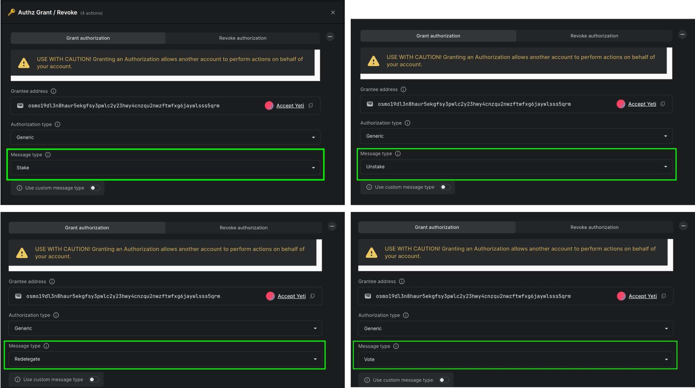 d. In this example the Authorization type is "Generic" and the Message types are "Stake," "Unstake," "Redelegate," and "Vote."