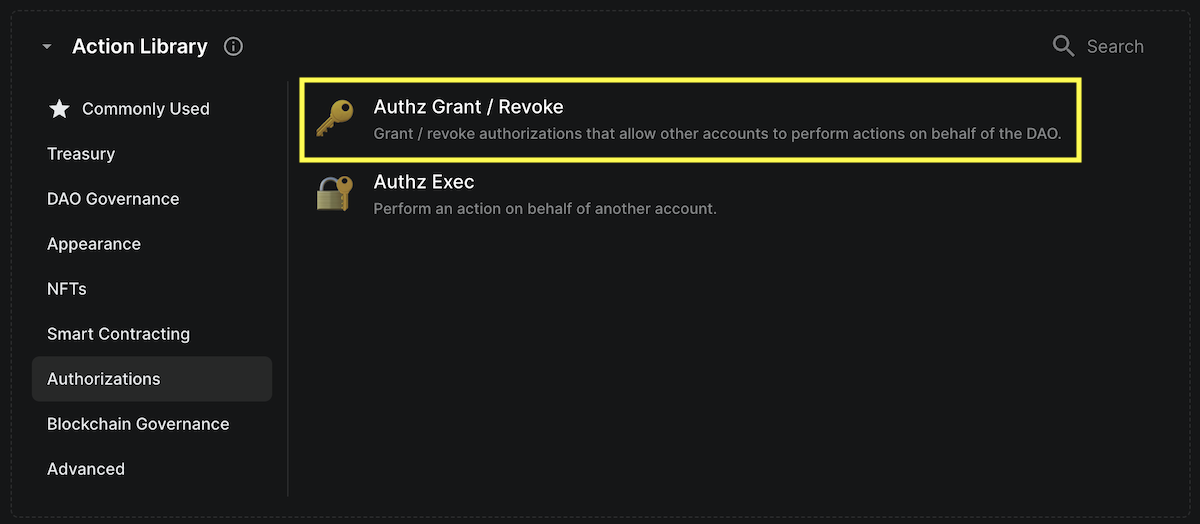 a. Scroll down to the Action section of the Create proposal page. Select Authz Grant / Revoke from the Authorizations tab.