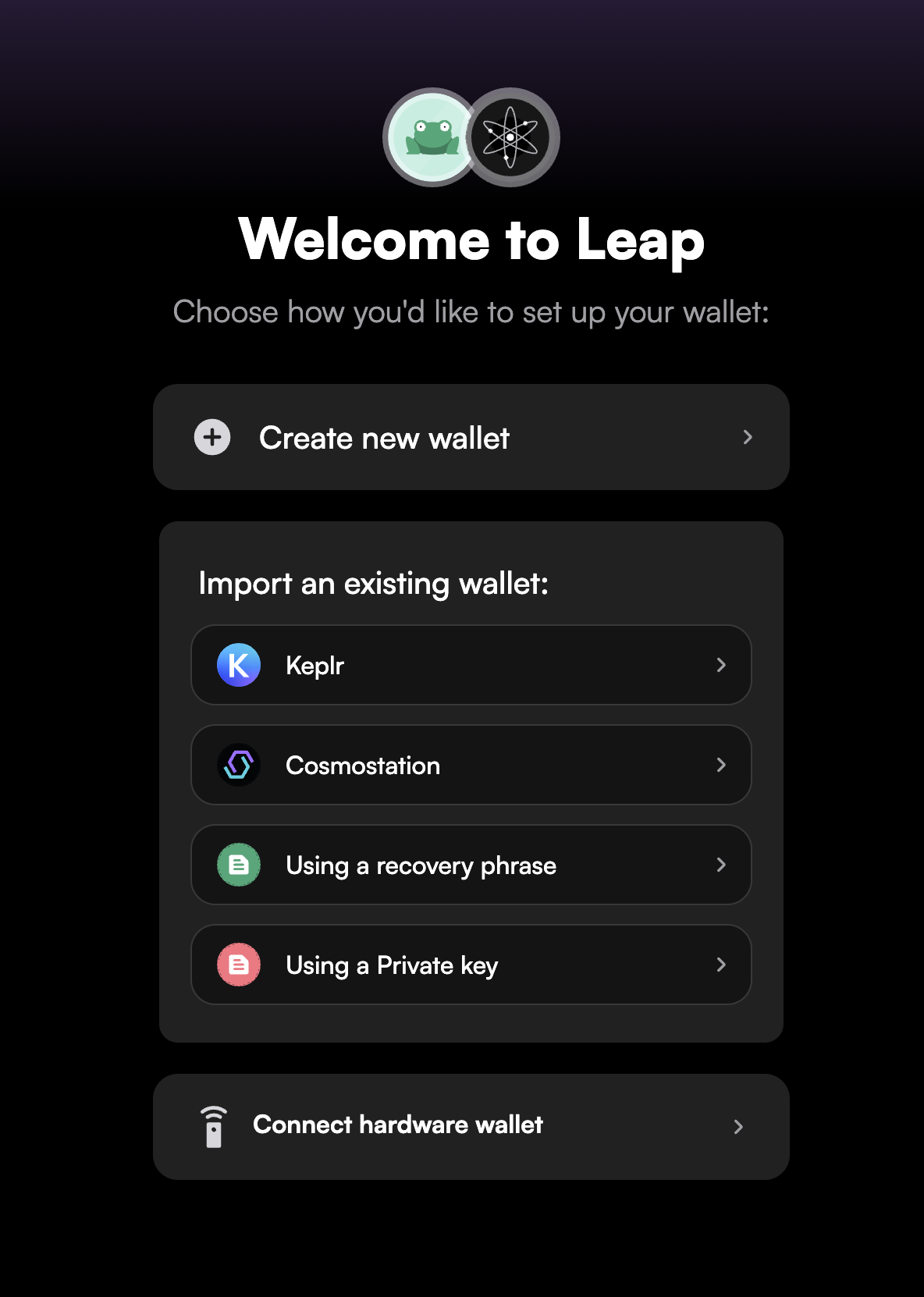 To use DAO DAO you'll need a wallet. A wallet is your digital identity on a blockchain. There are many options, but a good choice is the Leap wallet. You'll need to install that on your phone or browser before getting started.