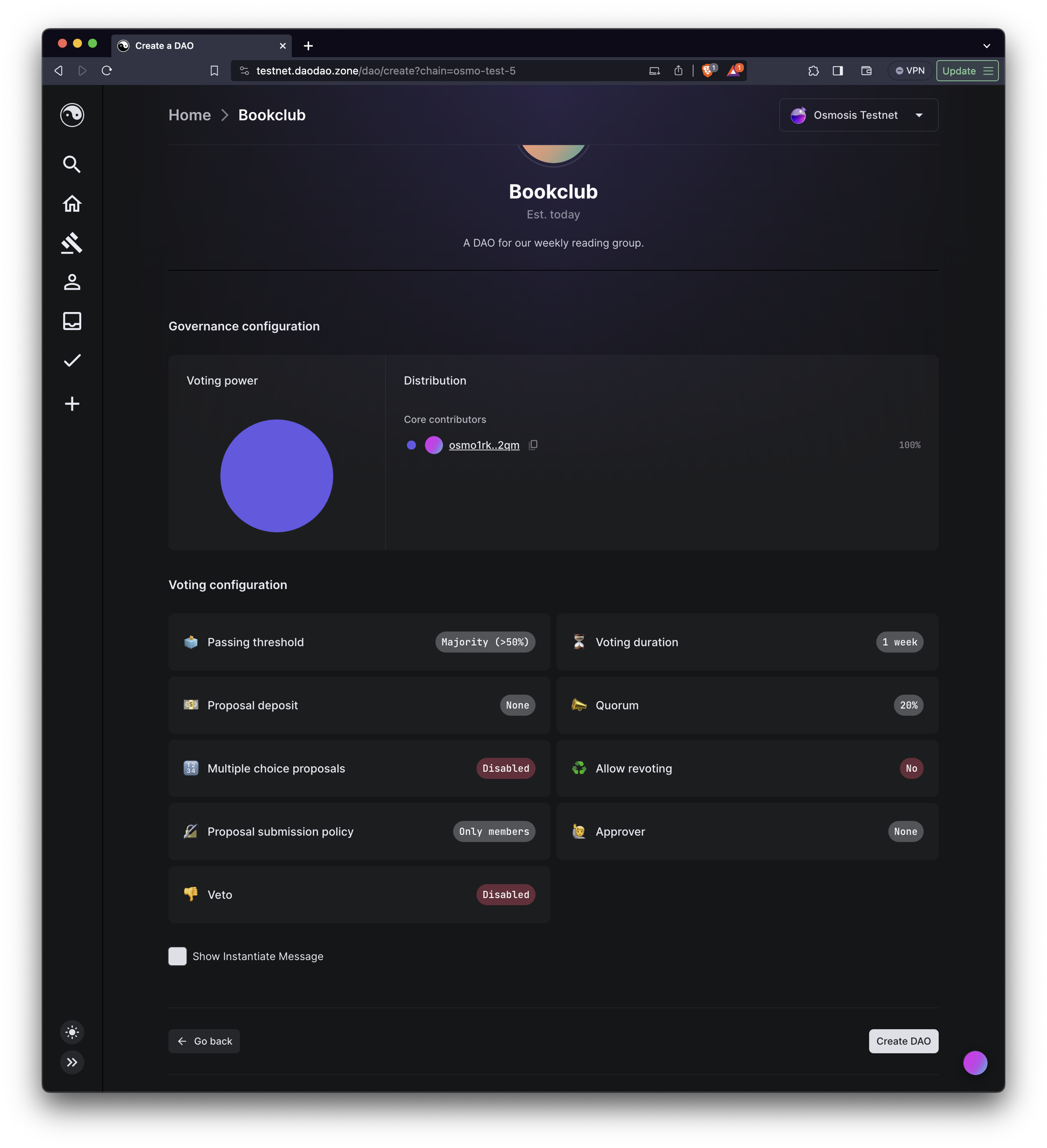 Go ahead and press Create DAO in the bottom right. If you see an error here, make sure you have some $OSMO in your testnet wallet.