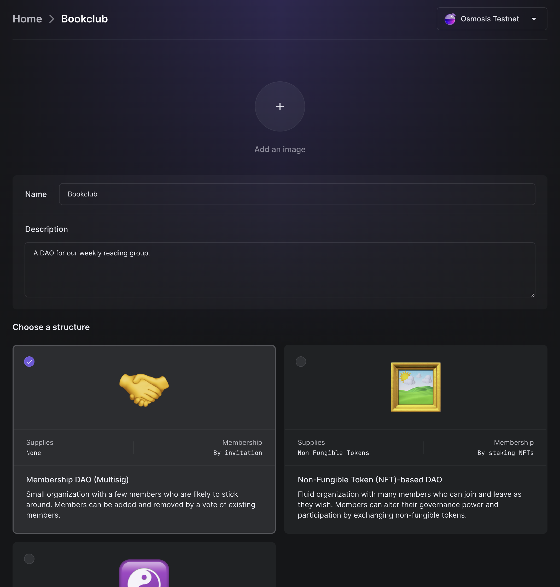 Let's create a DAO called Bookclub. We'll make our DAO member-based for simplicity.