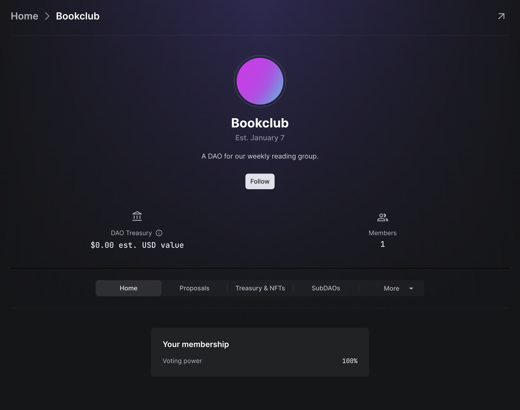 For this tutorial, we'll make a DAO for your reading group. This will let folks in your reading group vote on which books to read, organize money for snacks, and so on.