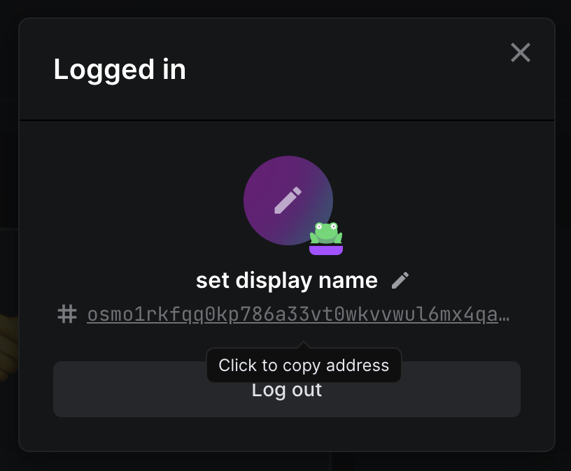 Once logged in, you will see your Osmosis testnet address. Click on it to copy and save it for the next step.