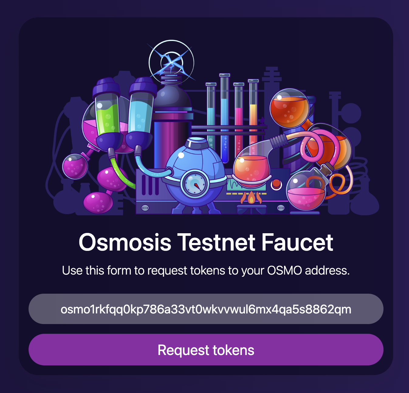 To get some testnet $OSMO, head over to faucet.testnet.osmosis.zone and paste your Osmosis address into the form. A bot should send you enough $OSMO to follow this tutorial.
