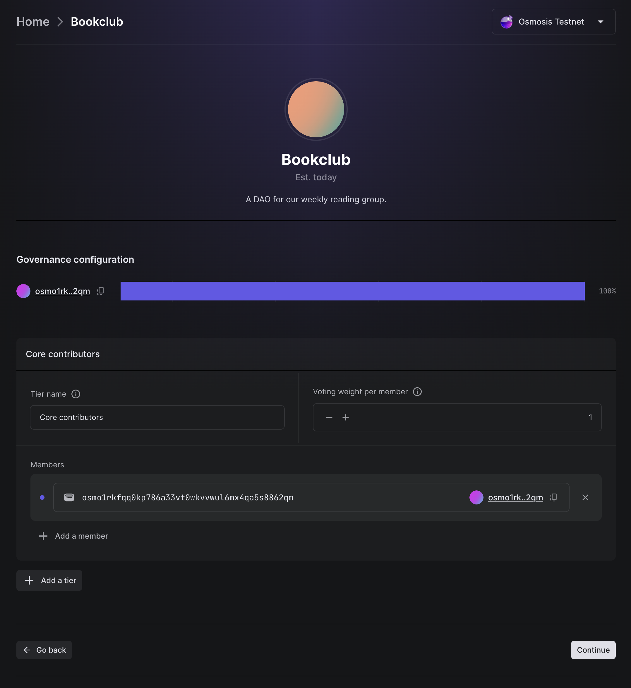 Now we can add the initial members of our DAO. If you're making this DAO with friends, add their Osmosis addresses during this step. Otherwise, you can start the DAO with only yourself and add new members via proposals later.