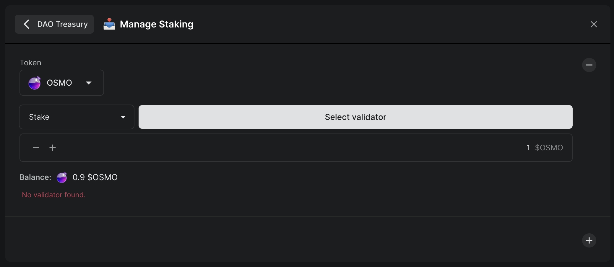 You can choose any token native to the chains the DAO has accounts on. If you want to stake tokens on a chain that the DAO does not have an account on, you have to create a cross-chain account on that chain first.