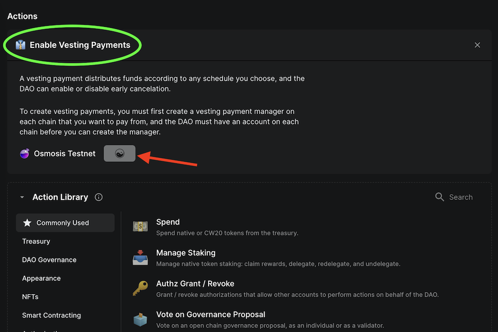To create vesting payments, you must first create a vesting payment manager on each chain that you want to pay from, and the DAO must have an account on each chain before you can create the manager.