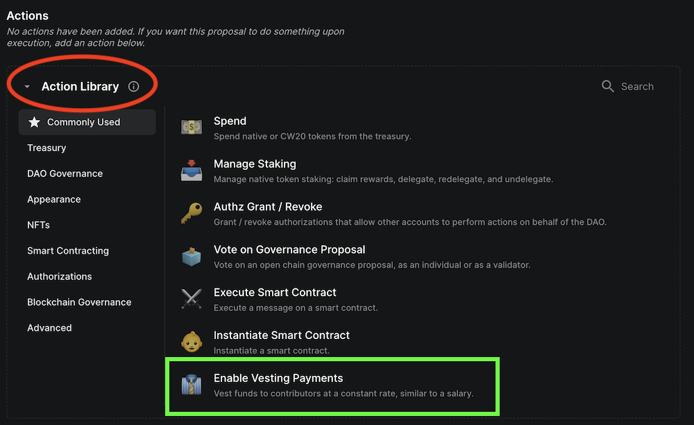 This feature allows DAOs to set up vesting contracts. A vesting payment distributes funds according to any schedule you choose, and the DAO can enable or disable early cancelation.