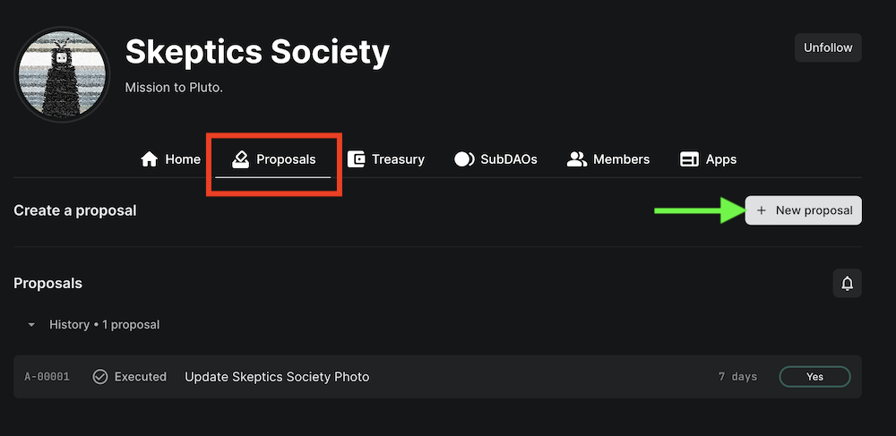 a. From your DAO page, select the Proposal tab and click the +Proposal button.