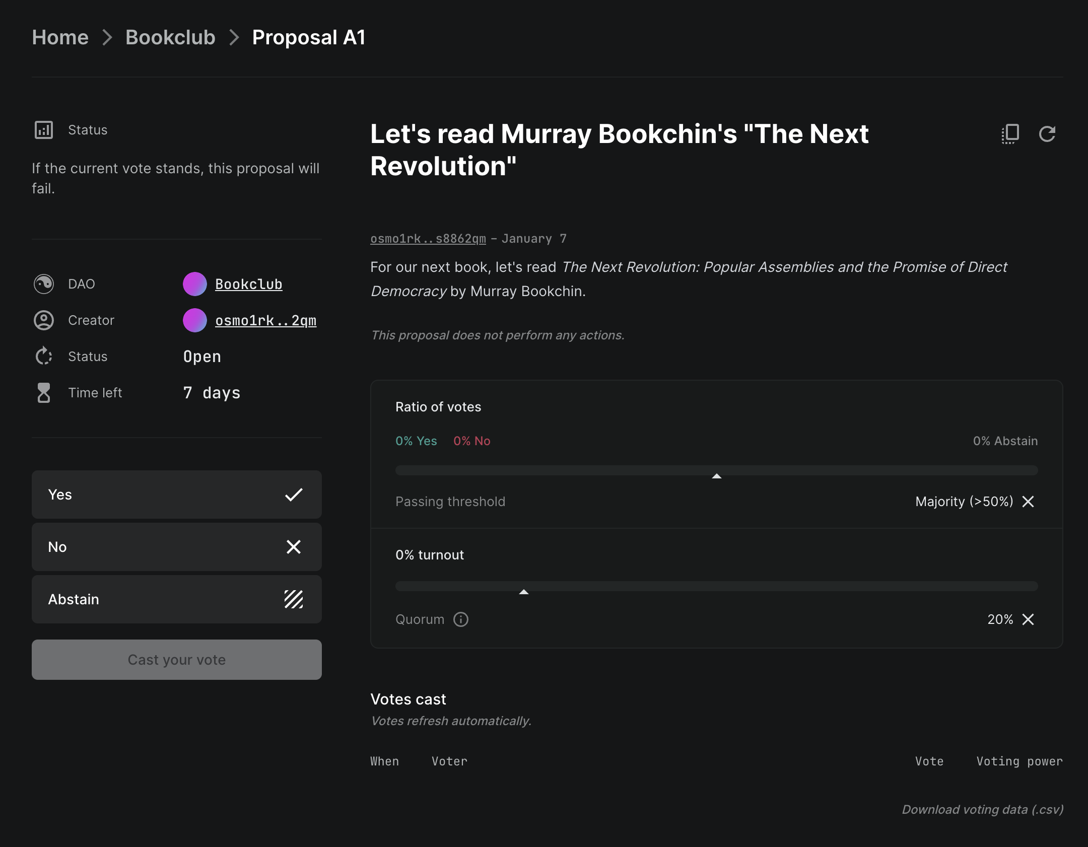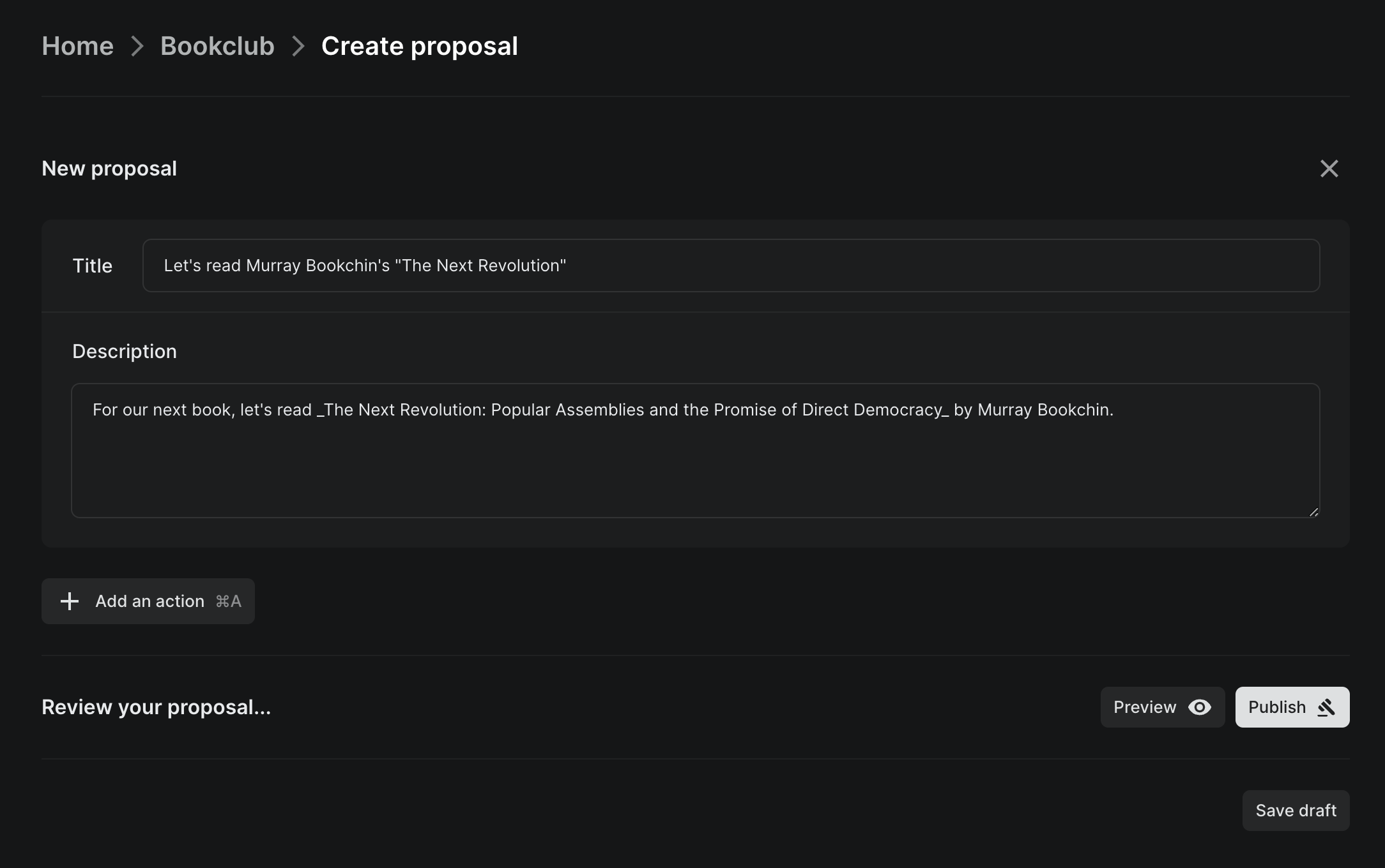 Since you were the first one here, it's only fair that you suggest what everyone read next. Let's create a proposal suggesting the group read Murray Bookchin's The Next Revolution: Popular Assemblies and the Promise of Direct Democracy.