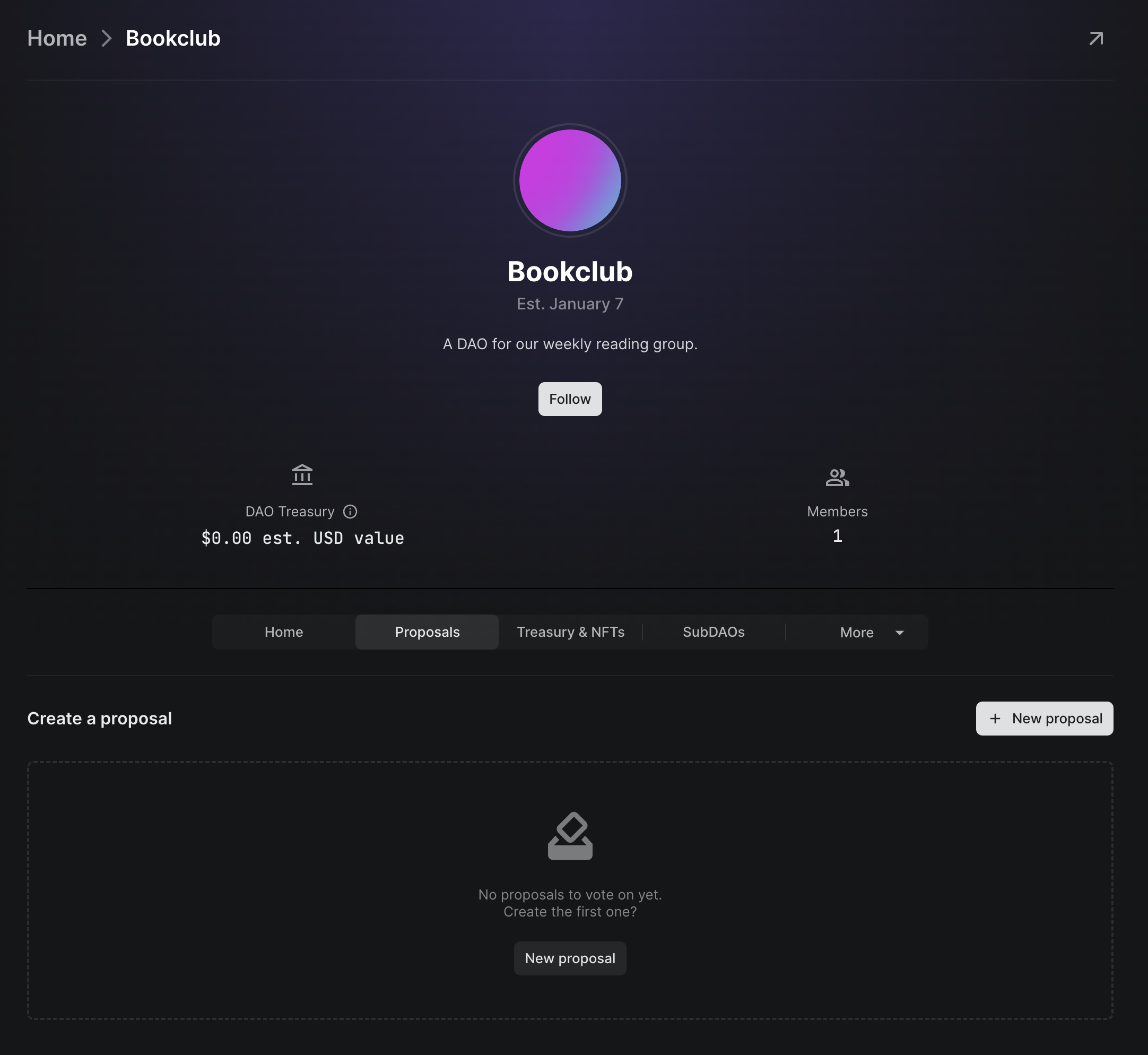 After creating a DAO for your book club, I'm sure you're busy telling all of your friends to download Leap so they can join you. Once they join your DAO, why don't we make a governance proposal for everyone to vote on?