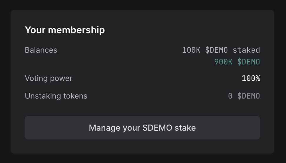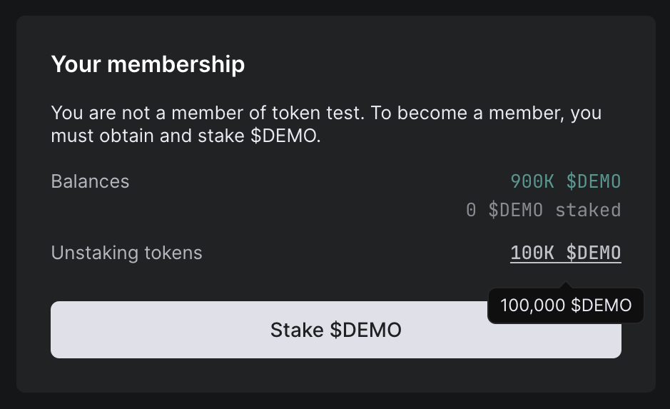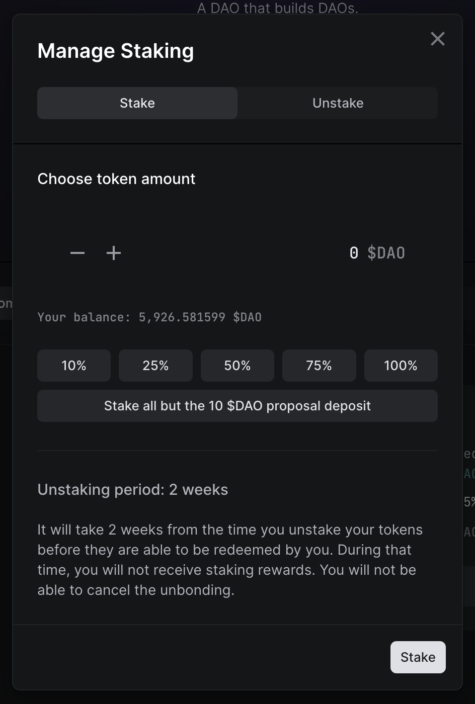 2. Some DAOs have an unstaking duration, which is the amount of time you must wait after unstaking your tokens before those tokens are available to you. If you are holding tokens in a DAO with a non-zero staking duration, and you think you may want to sell or trade those tokens quickly in the future, you may consider leaving some tokens unstaked.